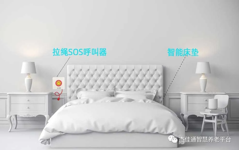 1、床頭安裝拉繩SOS呼叫器,當老人在床上感到不舒適時,可以通過拉繩或者按下呼叫器按鈕,把求助信息發送到值班中心或者子女手機上,值班中心電話會響起,同時值班中心大屏上即時顯示老人的信息,子女手機上也同時受到老人異常信息的推送。